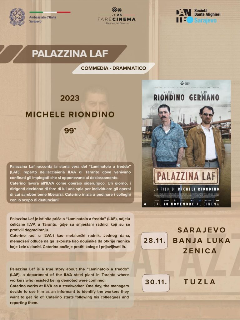 Svake godine, pa tako i u 2025. Ambasada Republike Italije u Sarajevu organizuje „Dana italijanskog filma u BiH“. Filmovi se besplatno prikazuju u kino dvoranama u Tuzli, Sarajevu, Banjoj Luci i Zenici. U Tuzli će biti prikazan film Palazzina laf, u režiji Rechele Riondino premijerno prikazan 2023. godine. Film je istinita priča o odjelu čeličane […]