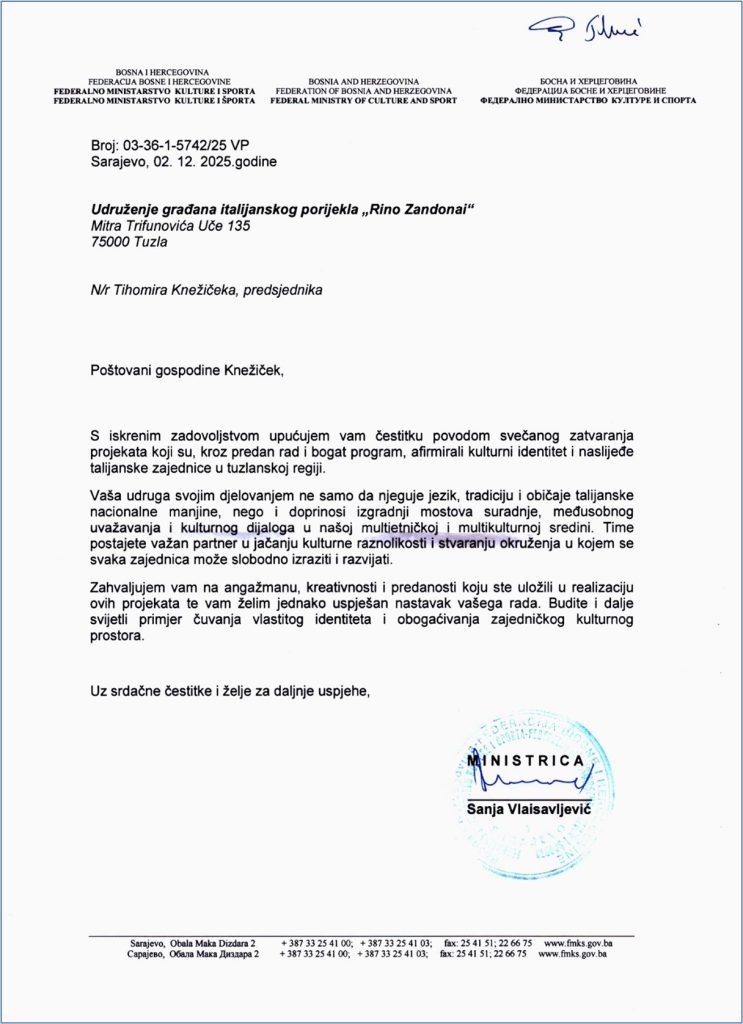 Federalnog ministarstva kulture i športa finansiralo je dva projekta koja su realizovana u 2025. godini. Za oba projekta urađena je interna evaluacija (procjena rezultata) projekta dana 8.12.2025. u prostorijama Udruženja. Evaluaciji su prisustvovali članovi Udruženja uključeni u projektne aktivnosti i drugi članovi Udruženja. Privi projekat pod nazivom „Forum italijanske muzike u Tuzli 2025“ je projekat […]