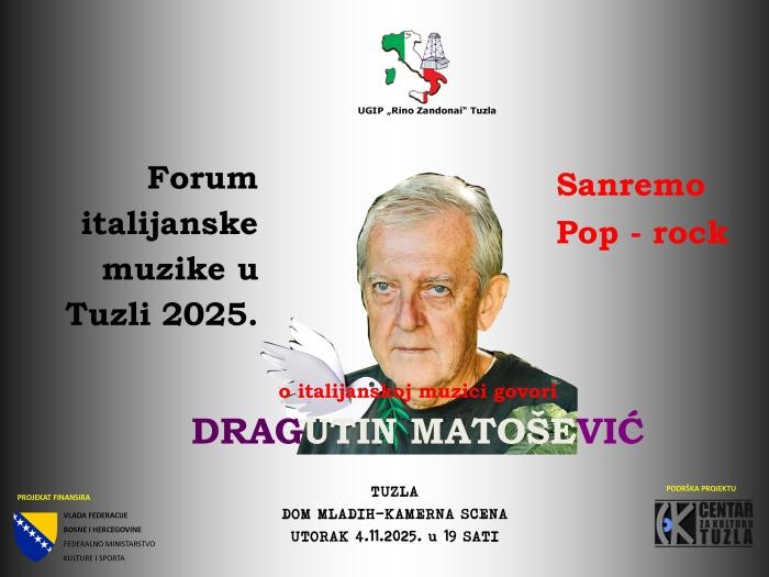 Udruženje građana italijanskog porijekla „Rino Zandonai“ Tuzla organizovalo je drugi Forum italijanske muzike koji se održao u Domu mladih Tuzla u utorak 4.11.2027. godine od 19 sati. Gost jednosatnog Foruma je bio Dragutin Matošević, koji je predstavio muziku festivala Sanrema, kao i uspjehe italijanske pop-rock scene. Audio-vizuelni događaj je bio prilika podsjećanja na hitove i […]