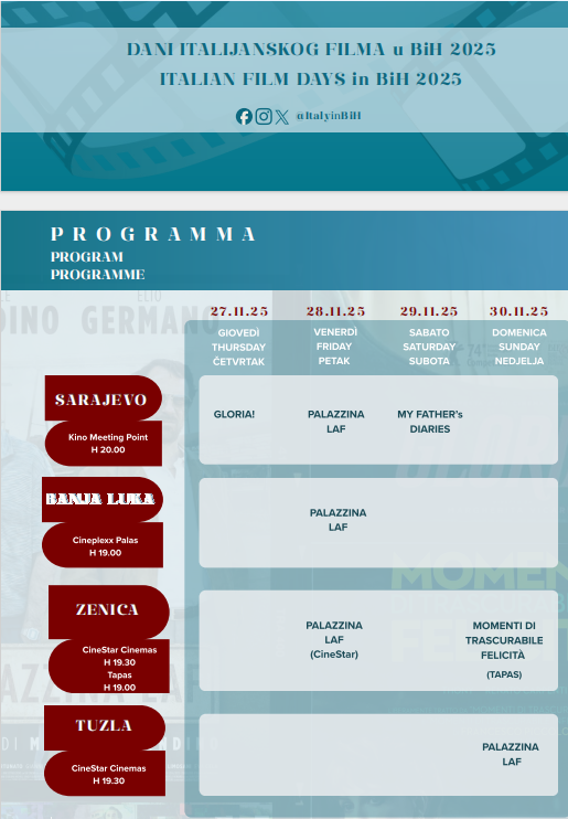 Svake godine, pa tako i u 2025. Ambasada Republike Italije u Sarajevu organizuje „Dana italijanskog filma u BiH“. Filmovi se besplatno prikazuju u kino dvoranama u Tuzli, Sarajevu, Banjoj Luci i Zenici. U Tuzli će biti prikazan film Palazzina laf, u režiji Rechele Riondino premijerno prikazan 2023. godine. Film je istinita priča o odjelu čeličane ILVA u Tarantu gdje su smješteni radnici koji se protive degradiranju. Ambasada Italije pozvala je zainteresovane da pogledaju film u Cinestaru (BCC) Tuzla 30.11.2025. od 19.30. sati.