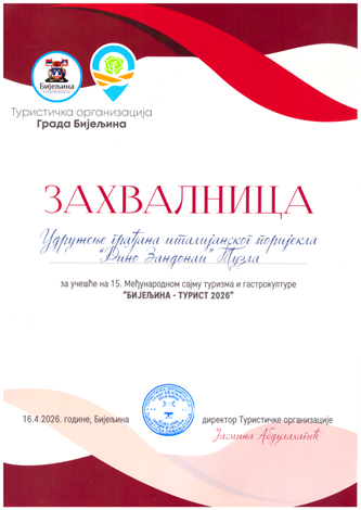 Udruženje „Rino Zandonai“ učestvovalo je na dvodnevnom sajmu turizma i gastrokulture „Bijeljina-turist 2026“ koje se održao u Hotelu Drina 16. i 17. aprila 2026. Udruženje učestvuje na sajmu duži niz godina, nudeći informacije o turističkim potencijalima provincije Trento, kao i simboličnom gastro ponudom. Turističke informacije su katalozi, prospekti, plakate, mape, knjige i natpisi koje obezbjeđuju turističke organizacije Trenta. Organizator sajma besplatno obezbjeđuje štand i potrebnu infrastrukturu, a Udruženje oprema štand i nudi jednostavna italijanska jela, pogodna za držanje u papirnoj salveti. Posjeta sajmu je zadovoljavajuća, a interes za italijanskom turističkom ponudom je takođe na zadovoljavajućem nivou. Većina posjetilaca je zainteresirana za planinski turizam, jezerski turizam i rekreativni biciklizam. Prvog dana sajma učestvovali su Željko Mott, Vlasta Mott i Tihomir Knežiček, a drugog dana Željko Mott, Ljerka Knežiček i Željko Knežiček.  Udruženje je dobilo zahvalnicu za učešće i poziv za dolazak na sajam iduće 2026. godine.